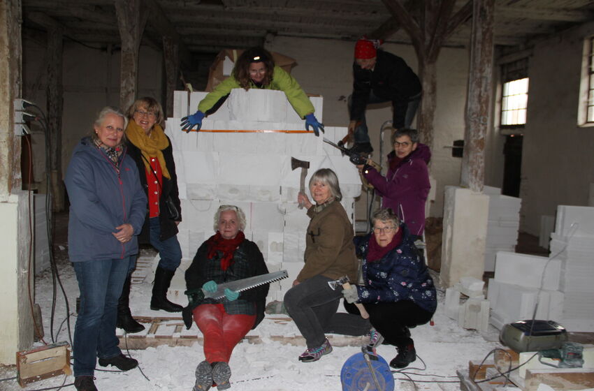 Schnittmuster aus Packpapier an der Wäscheleine, in der Mitte des Raumes ein hoher Berg aus Yton-Steinen, in einer Ecke ein kleiner Tisch mit Kaffee und Tassen – hier lässt es sich künstlerisch ...