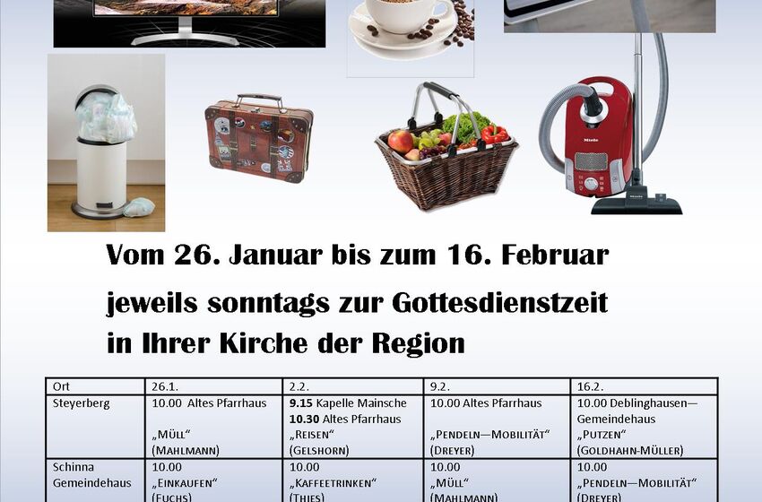 vom 26. Januar bis 16. Februar jeweils sonntags zur Gottesdienstzeit in Ihrer Kirche der Region predigen die Pastor*innen der Mittelregion unseres Kirchenkreises zu Alltagsthemen, wie z. ...