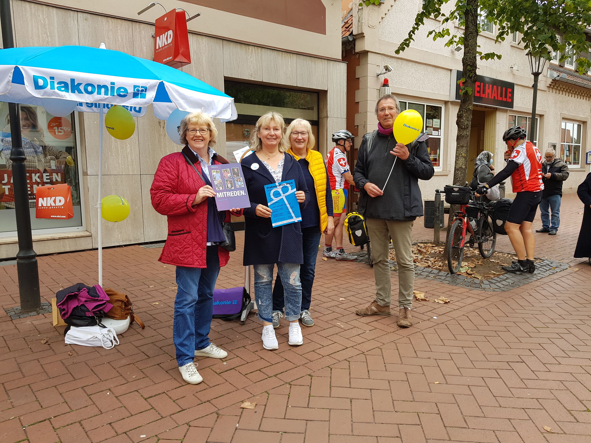 Was wäre die Diakoniewoche im Kirchenkreis Stolzenau-Loccum ohne den jährlichen Stand auf dem Stolzenauer Wochenmarkt? So informierten am 8. September die Sozialarbeiterinnen Ingelore Westhoff, Marion Kohlmeier, Diakoniepastor Ingo Krause und Superintendentin Dr. Goldhahn-Müller über die große Angebotspalette im Diakonischen Werk des Kirchenkreises. Die Besucherinnen und Besucher am Stand erhielten wichtige Auskünfte über die Beratungsarbeit im DW in der Langen Straße 47, die von der Kurenberatung und der Schwangerenberatung über die Badekartenaktion bis hin zur Hilfe beim Kauf von Schulbüchern und Schulmaterial reicht.
