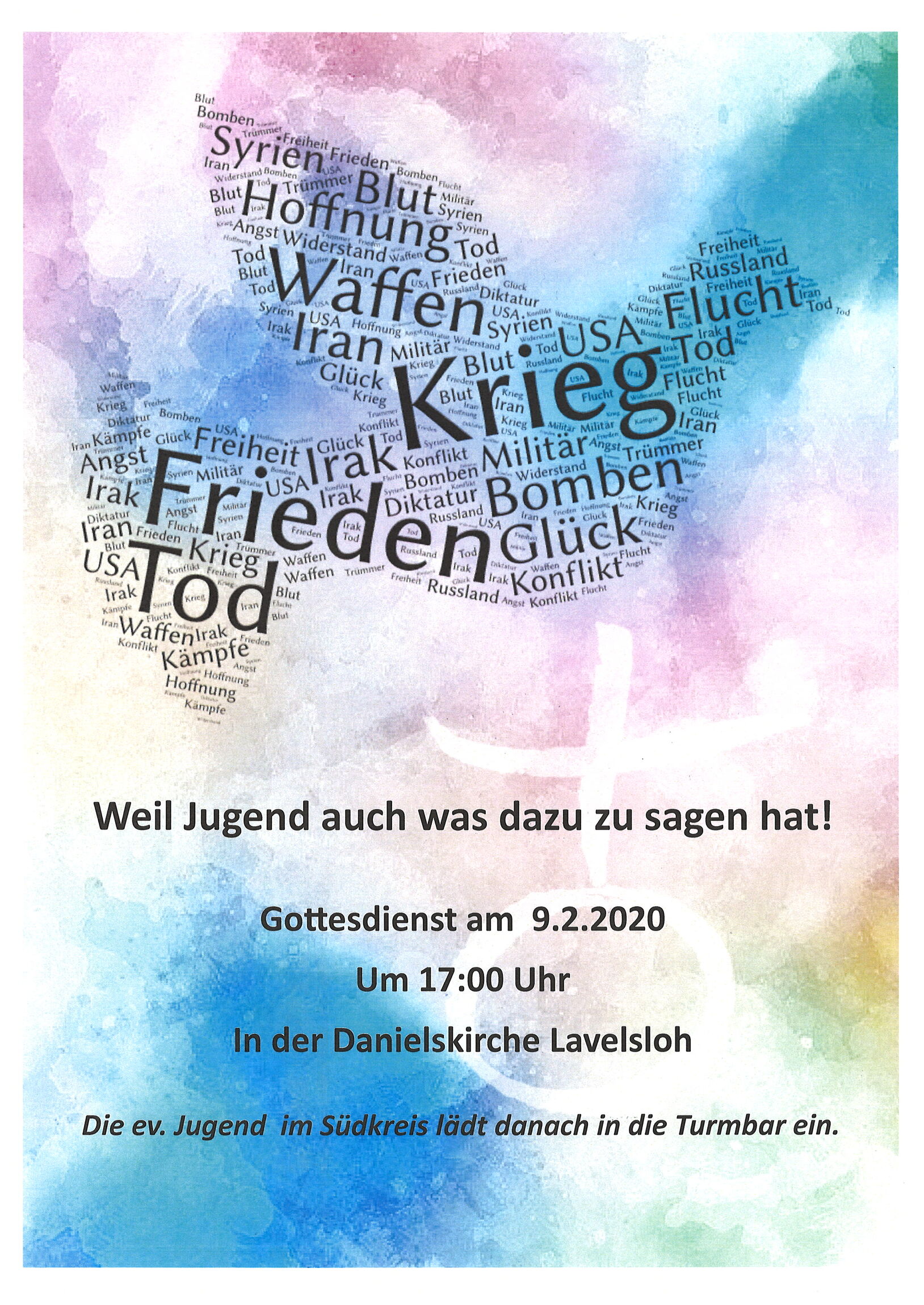 Die Evangelische Jugend im Südkreis des Kirchenkreis Stolzenau und FSL'lerin Kara Heile laden herzlich zu einen Jugendgottesdienst am Sonntag, dem 9. Februar 2020 um 17 Uhr nach Lavelsloh in die Danielskirche ein. In dem Gottesdienst geht es zum Einen um Kriegsspiele im Netz zum Anderem um Kriege in der realen Welt, deren Folgen und was die Jugend dazu zu sagen hat. Im Anschluss an den Gottesdienst ist ein Austausch in der Turmbar der Danielskirche geplant.
