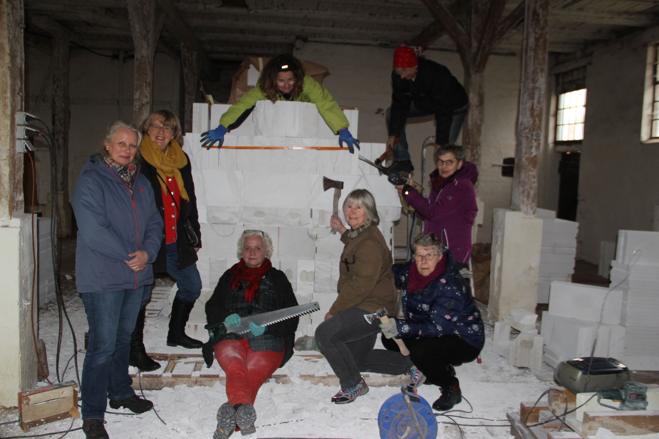 Schnittmuster aus Packpapier an der Wäscheleine, in der Mitte des Raumes ein hoher Berg aus Yton-Steinen, in einer Ecke ein kleiner Tisch mit Kaffee und Tassen – hier lässt es sich künstlerisch gut arbeiten auf dem Klostergelände in Schinna. ‚Atelier Schweinestall‘, so haben die Damen der Kreisfrauen-AG im Kirchenkreis Stolzenau-Loccum unter der Leitung von Anke von Claer-Schaar liebevoll die Räumlichkeit genannt, die Ihnen Ute Heitmüller von der Stiftung Kloster Schinna dankenswerterweise für die Umsetzung ihres Kunstprojekts zur Verfügung gestellt hat. Unter dem Jahresthema des Kirchenkreises ‚Da blüht uns was‘ soll eine große Skulptur entstehen, die die gefährdete Erde in den Blick nimmt. Eine Skulptur, die sich als Mahnmal gegen Umweltzerstörung, aber auch Rassismus, Terror und Gewalt versteht. Der größte Teil der Steine wurde von der Firma Drübber aus Stolzenau gespendet. Bauingenieur Jürgen Gehrking wird für das Fundament und die Statik sorgen. Im August ist die feierliche Einweihung geplant. Bis dahin wird noch viel gemeißelt, gehämmert und gehobelt im ‚Atelier Schweinestall‘.
