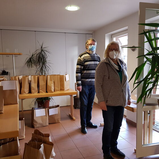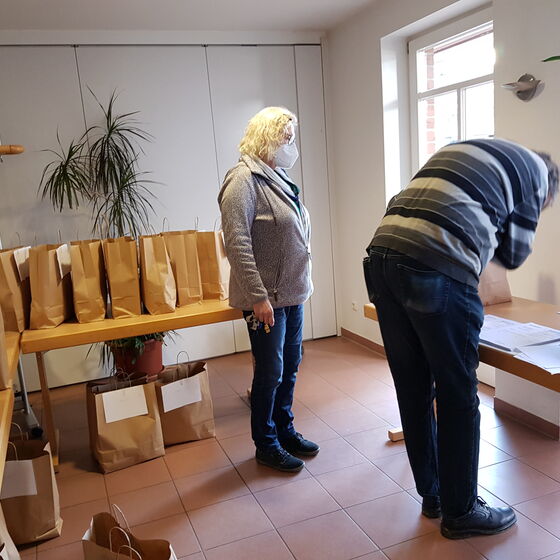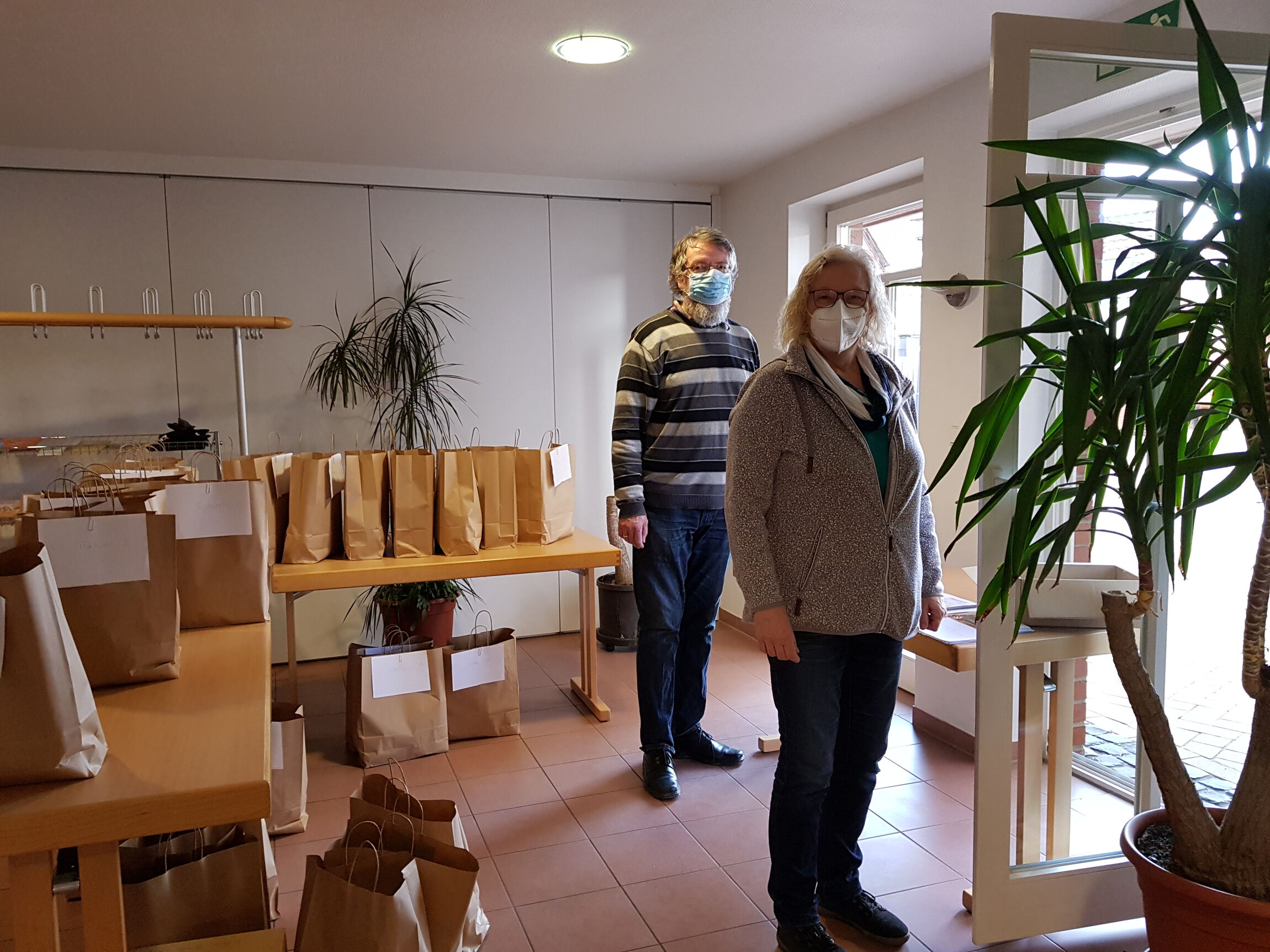 Das Diakonische Werk unseres Kirchenkreises hatte bereits in der Adventszeit Carepakete in Form von Taschen mit Kaffee, Keksen, und Obst gepackt, um von Armut Betroffene zu unterstützen. An die 50 Taschen haben Marion Kohlmeier und Clemens Becker vom DW-Team verbunden mit einem Weihnachtsgruß überreichen können.
