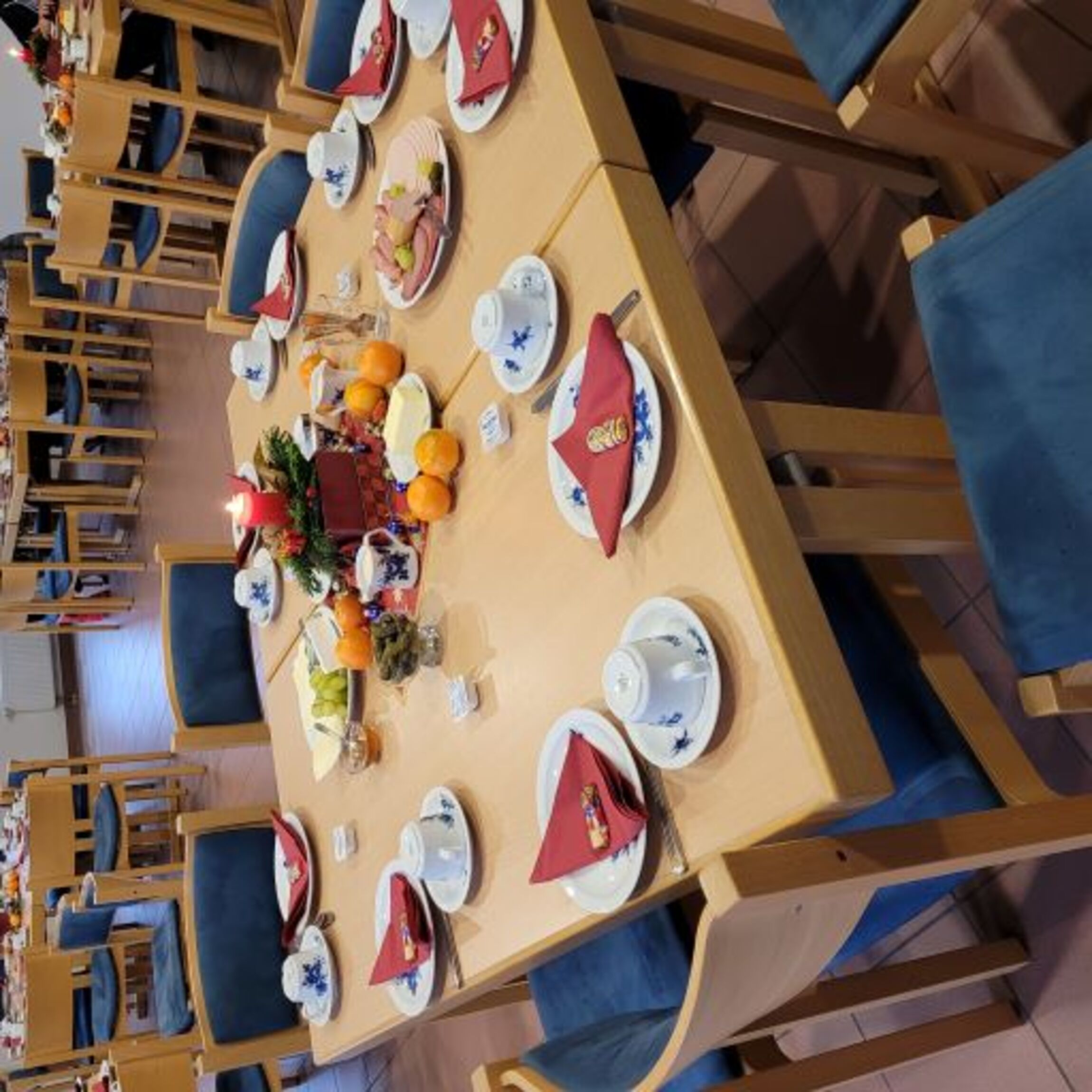 Adventlich geschmückte Tische, Kaffeeduft und Kerzenschein trugen zu einer wohligen Atmosphäre beim Adventlichem Frühstück der Diakonie bei.
