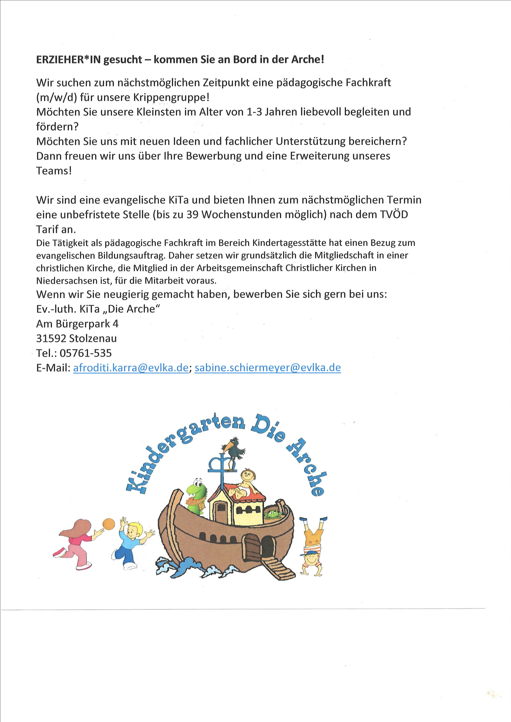 Wir sind eine evangelische KiTa und bieten Ihnen zum nächstmöglichen Termin eine unbefristete Stelle (bis zu 39 Wochenstunden möglich) nach dem TVÖD Tarif an.