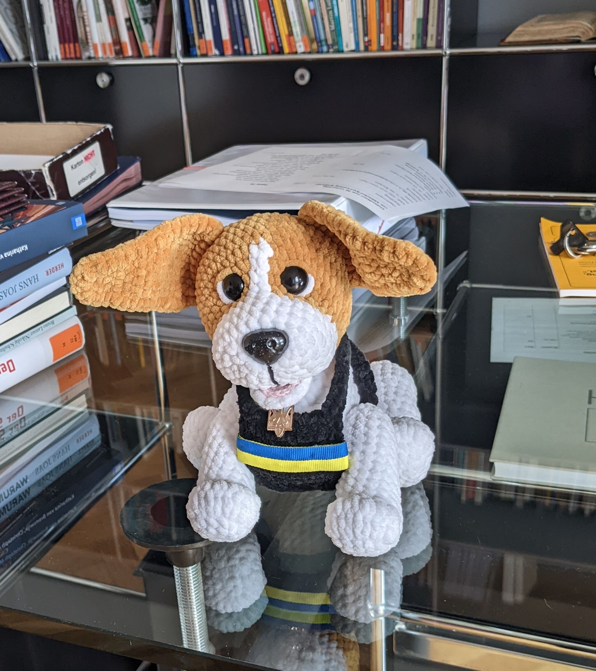 Auf meinem Schreibtisch steht seit ein paar Tagen ein kleiner Hund. Ein gehäkelter Jack Russel Terrier. Er trägt das Geschirr eines Minensuchhundes mit den Nationalfarben der Ukraine. Ich habe ihn bei meinem Besuch in der Ukraine geschenkt bekommen. Er ist dem echten Jack Russel Terrier nachempfunden, der im vergangenen Jahr von Präsident Selenskyj ausgezeichnet worden ist. „Patron“, so heißt er, hat mehr als 200 Minen aufgespürt. Nun tröstet er als Stofftier viele Kinder in der Ukraine.