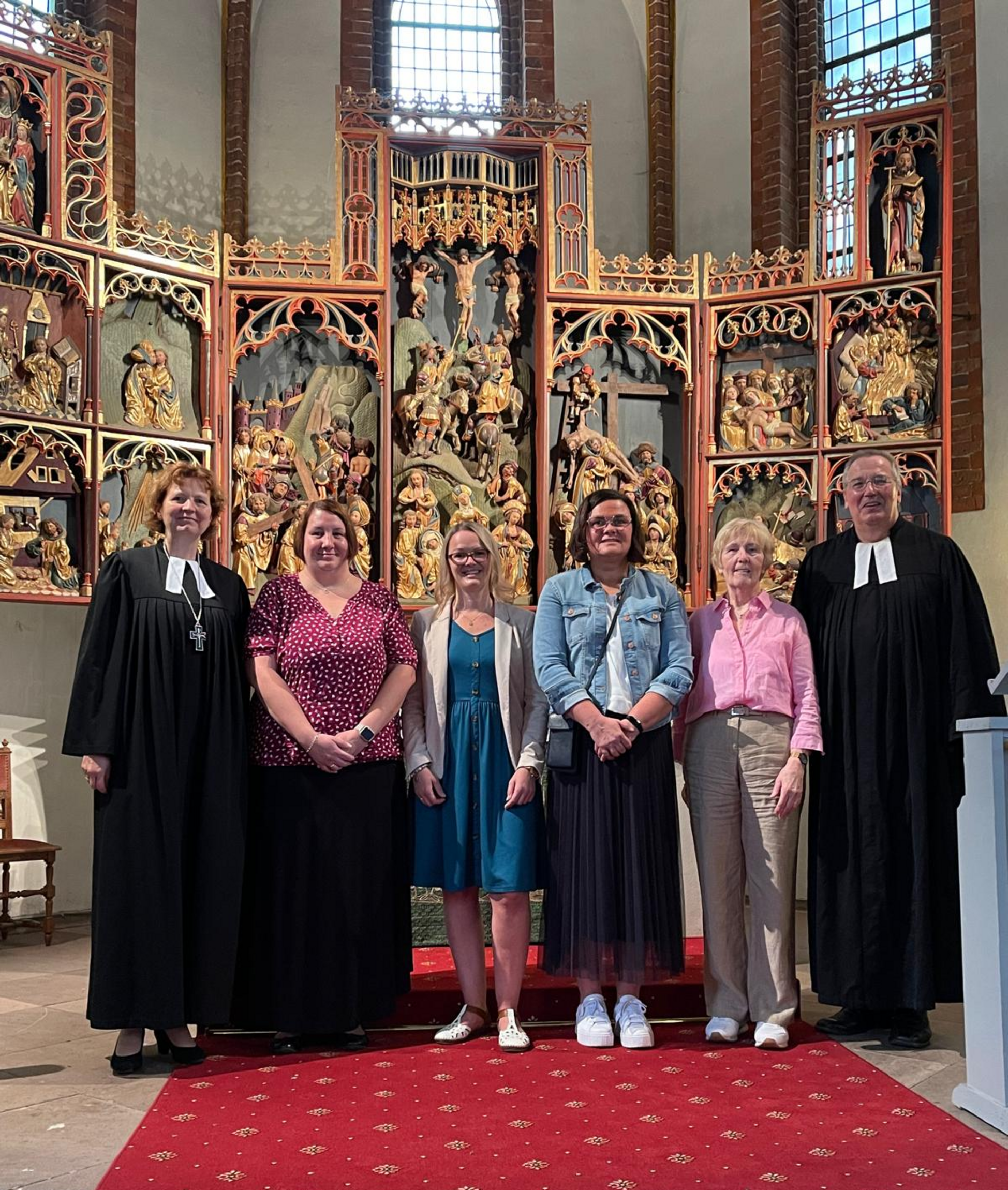 Die Predigt hielt zur großen Freude aller Anwesenden Regionalbischöfin Sabine Schiermeyer, die in ihrer Zeit als Superintendentin noch die Einstellungsgespräche geführt hatte. Pastor Ingo Krause führte dann als stellvertretender Superintendent die drei Mitarbeiterinnen ein. Nach dem offiziellen Teil begrüßt die stellvertretende Kirchenkreisvorstandsvorsitzende Ilse Klein-Schumacher die Eingeführten mit herzlichen Worten.