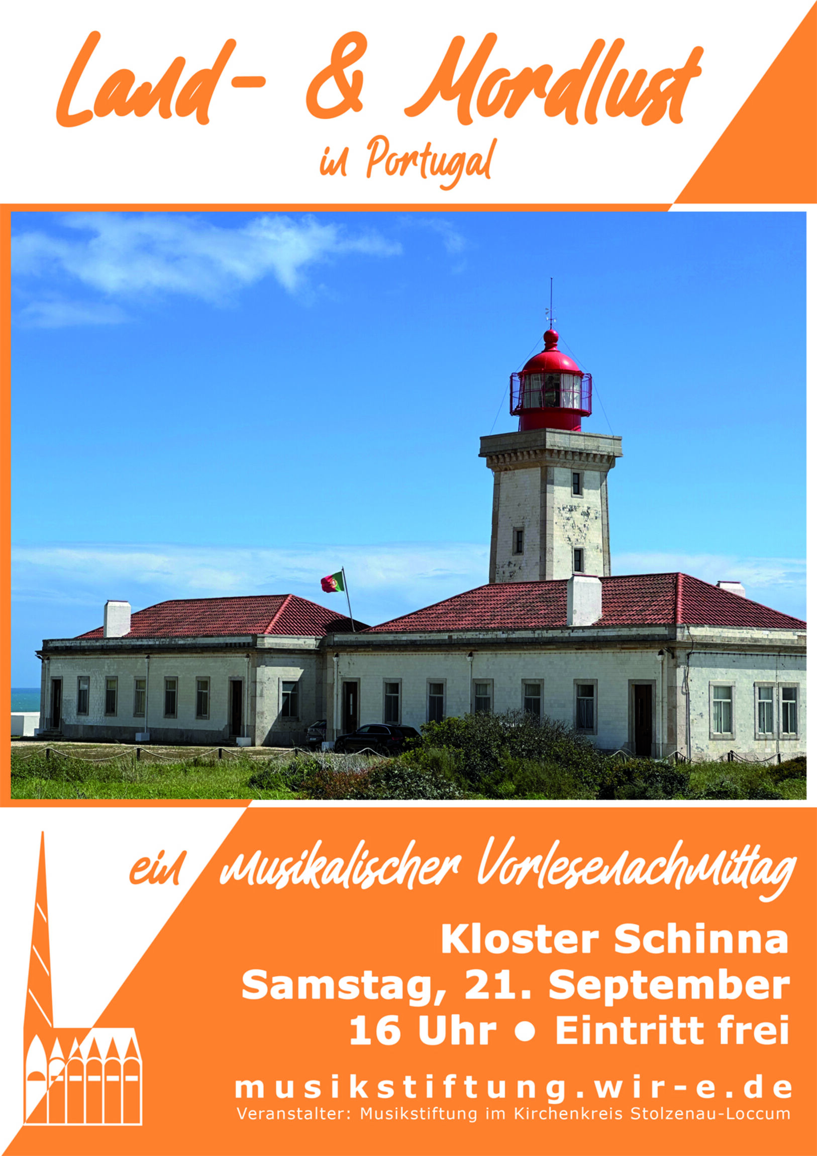5. Land-& Mordlust lädt ein zum musikalischen Vorlesenachmittag in die Klosterkirche Schinna Die Musikstiftung des Kirchenkreises Stolzenau-Loccum veranstaltet zum fünften Mal einen musikalischen Vorlesenachmittag. In diesem Jahr werden die Zuhörer in das südwestlichste Land Europas entführt, nach Portugal. Die Klosterkirche Schinna bietet dabei am 21. September wieder einen geeigneten Ort für Mordgeschichten. Die Zuhörer werden entführt in die Welt portugiesischer Landschaft, portugiesischen Lebens und portugiesischer Musik. Die Handlungen der ausgewählten Krimis und Texte zum Land Portugal. Helma Stuckmann und Dietmar Rehse werden für Sie lesen. Kreiskantor André Hummel und der Jazz-Pop-Gospelchor werden musikalisch die Veranstaltung bereichern. Das Team der Musikstiftung wird sich um portugiesische Köstlichkeiten kümmern.