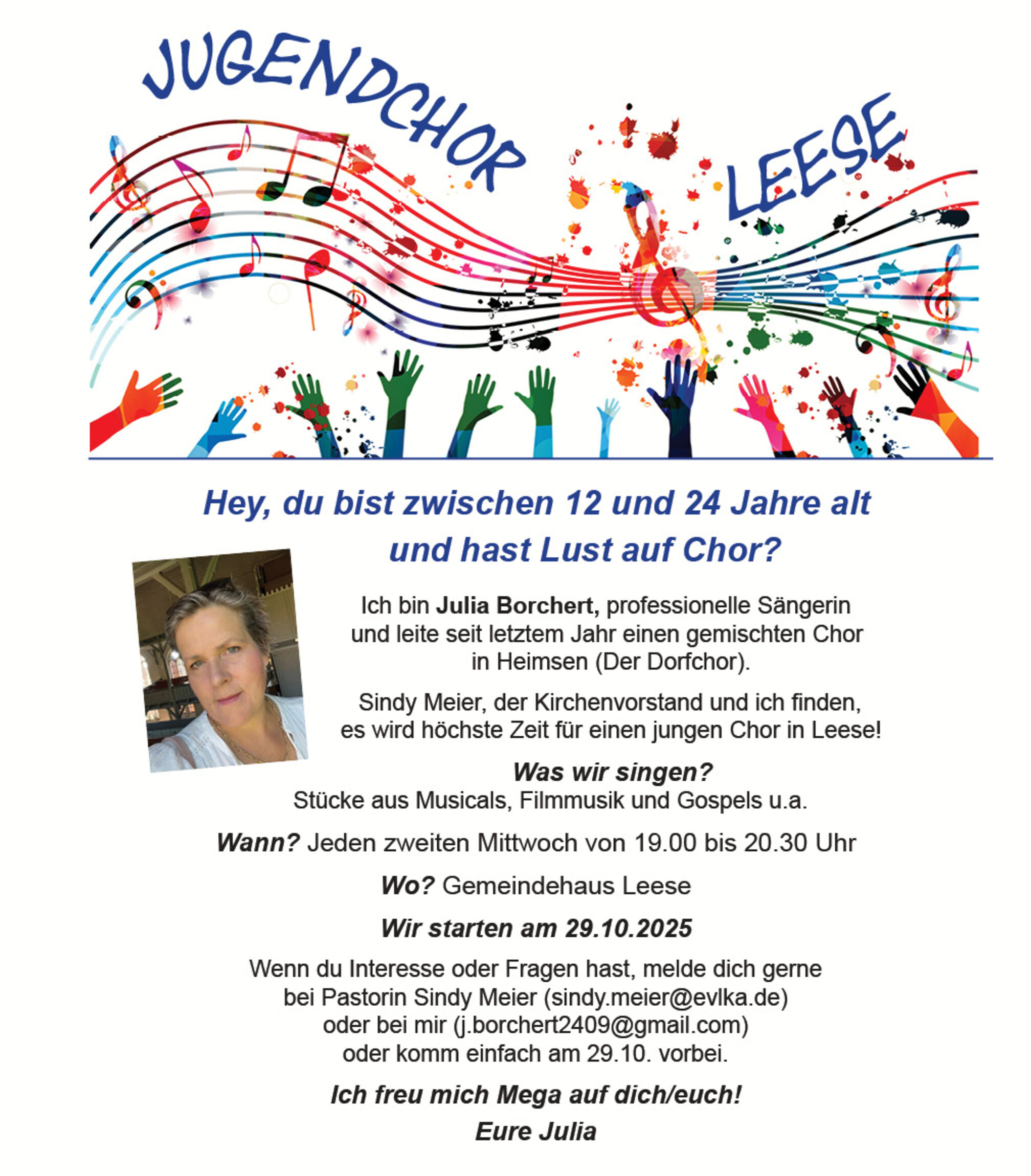 Bei Interesse oder Fragen gibt es weitere Infos bei Pastorin Sindy Meier (sindy.meier@evlka.de) oder bei der Chorleiterin (j.borchert2409@gmail.com).
