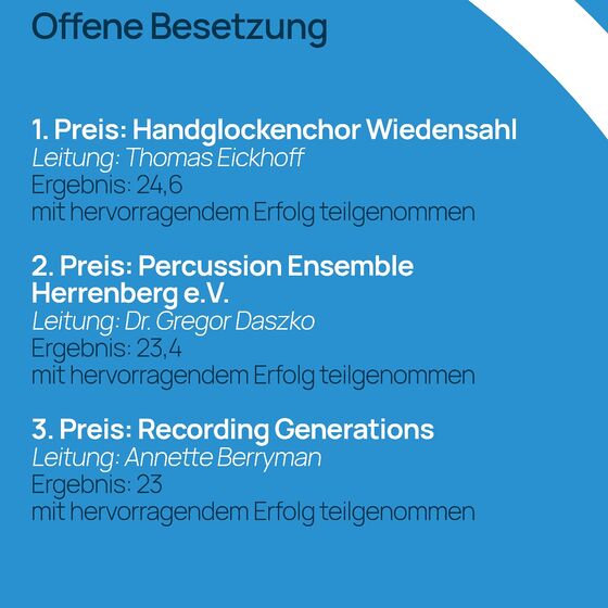 Mit 24,6 von 25 möglichen Punkten läutete sich der Handglockenchor Wiedensahl aus Niedersachsen beim 11. Deutschen Orchesterwettbewerb in Wiesbaden auf den 1. Platz in der „Offenen Kategorie“. Die Glöcknerinnen und Glöckner aus dem Wilhelm-Busch-Geburtsort im Landkreis Schaumburg behaupteten damit zum vierten Mal in Folge ihren Spitzenplatz in der Deutschen Amateurorchesterszene.